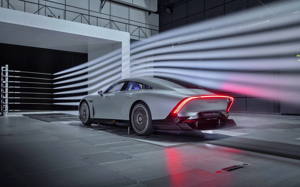 전면 부부터가 둥글고 낮게 깔렸으며 AMG 1처럼 2d 엠블럼이 그려졌습니다. 헤드램프 그래픽은 벤츠의 삼각별을 형상화했으며 범퍼 양 끝에 에어 덕트 앞바퀴의 공기 저항을 완화시키는 휠 에어 커튼을 만들어주었습니다. 측면의 실루엣은 폭스바겐 x의 원이나 맥라렌 스피드 테일과 흡사한데요. 뒤로 갈수록 좁아지는 이런 빗방울 형태는 공기 역학에서 가장 이상적인 형태입니다.